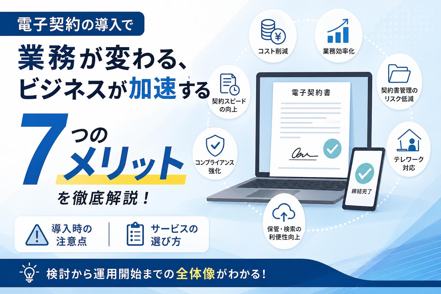 電子契約の導入を検討する担当者が最初に知りたいのが「実際にどんなメリットがあるのか」という点です。この記事では、コスト削減や業務効率化といった代表的な効果から、契約書管理のリスク低減、テレワーク対応まで7つのメリットを具体的に解説します。あわせて導入時の注意点やサービスの選び方も紹介するため、検討から運用開始までの全体像を把握できます。